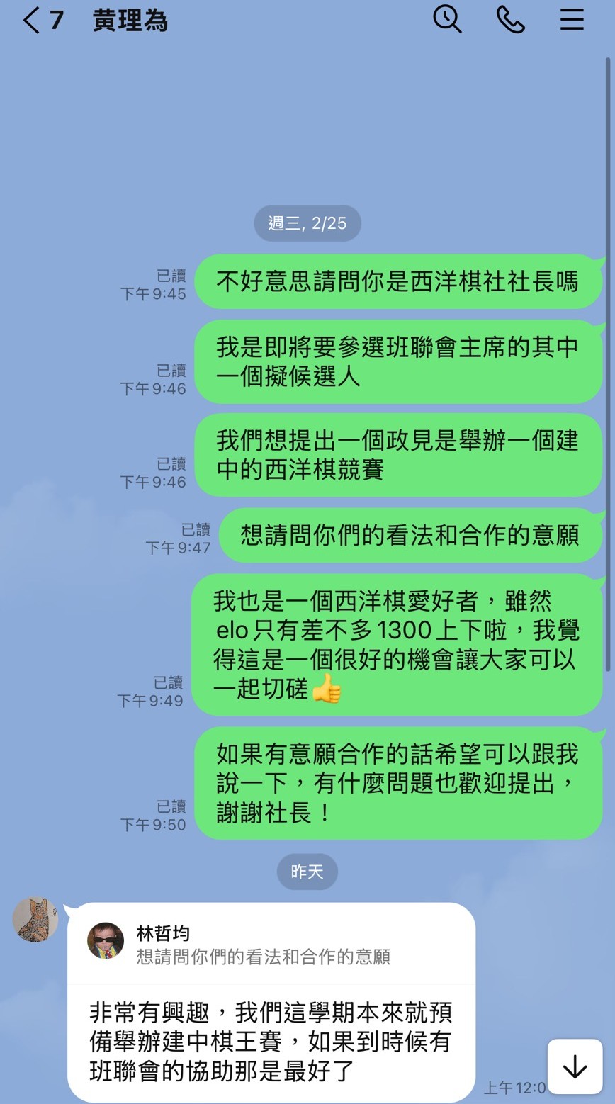 "我相信每位同 學的聲音都應該被聽見。我將致力於建立更透明的溝通管道,讓班聯會真正成為同學們的代言人。"